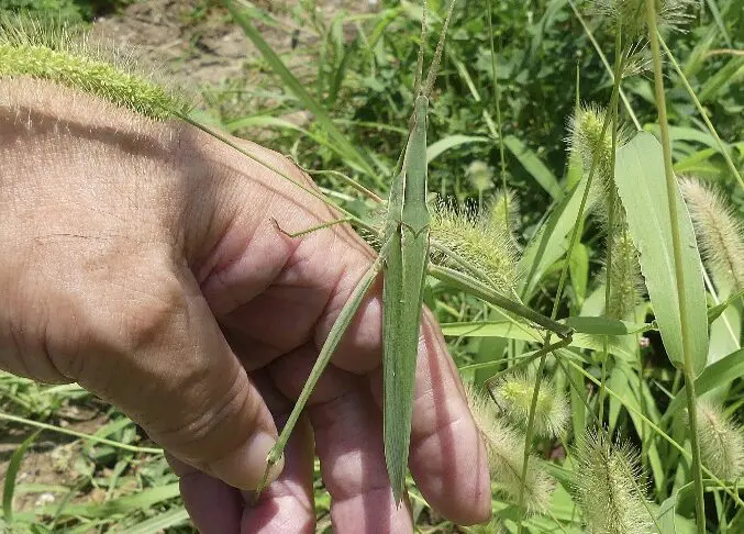 また、オンブバッタやショウリョウバッタはススキやエノコログサなどのイネ科の草を食べるため、イネ科の植物の草に止まっていることが多く、コオロギの仲間は地面の草や落ち葉の下にいます。秋になるとコオロギは昼間でも鳴いていますから、鳴き声のするところにガサガサと音を立てて入っていくと驚いて出てくることがあります。