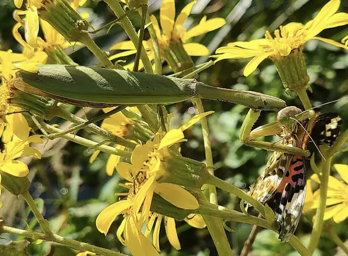 秋になるとセイタカアワダチソウやセンダングサなど黄色き花が目立ちますね。この花は外来種ですが、花が少なくなった秋の貴重な蜜源となっているので、チョウやミツバチが訪れます。また、これらの虫を狙いにやってくるのが、昆虫界のハンターと言われるカマキリです。
