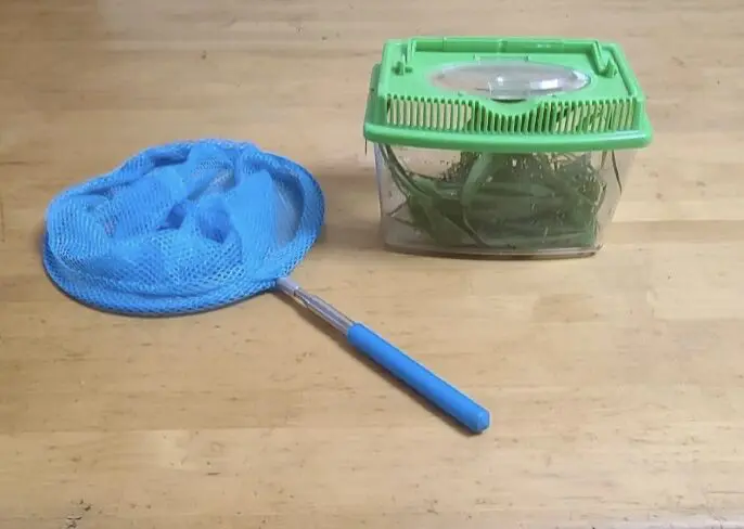 高いところにいるセミや空を飛び回るトンボなどを採るときは、柄の長い網が必要になりますが、シジミチョウや低いところに止まるトンボを採るときは、100円ショップで売っているような小さな網で十分ですし、バッタやコオロギは素手で捕まえることもできます。